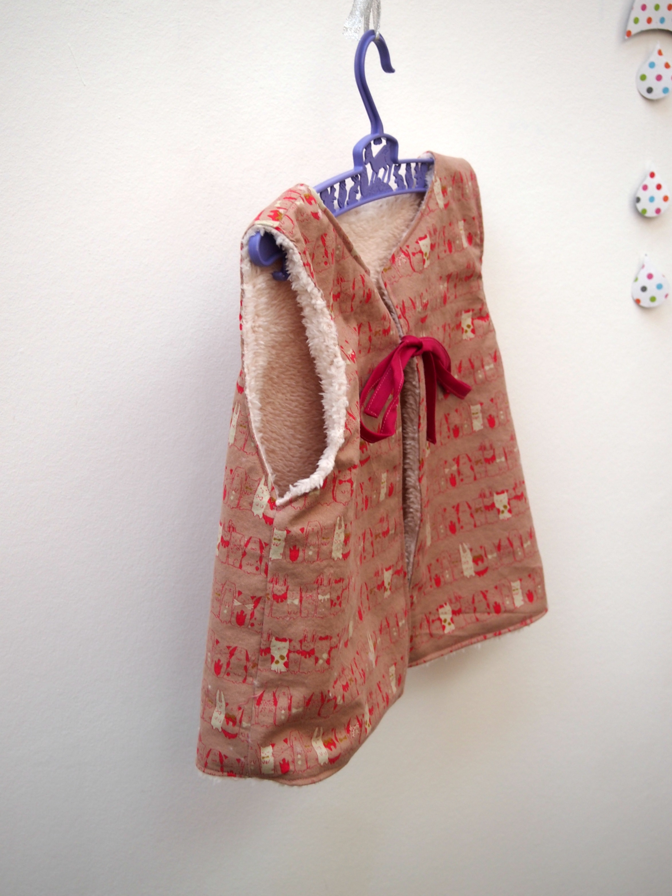 Pour gâter une autre jeune fille dont le petit frère avait eu les épaules réchauffées par de petits renards, une généreuse amie m’a commandé une version fille du fameux gilet de berger.